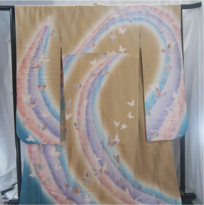 【振袖セット】芥子色に虹と蝶々柄の振袖 【振袖フルセット】すぐ着られる一式セット|成人式・写真撮影にも◎