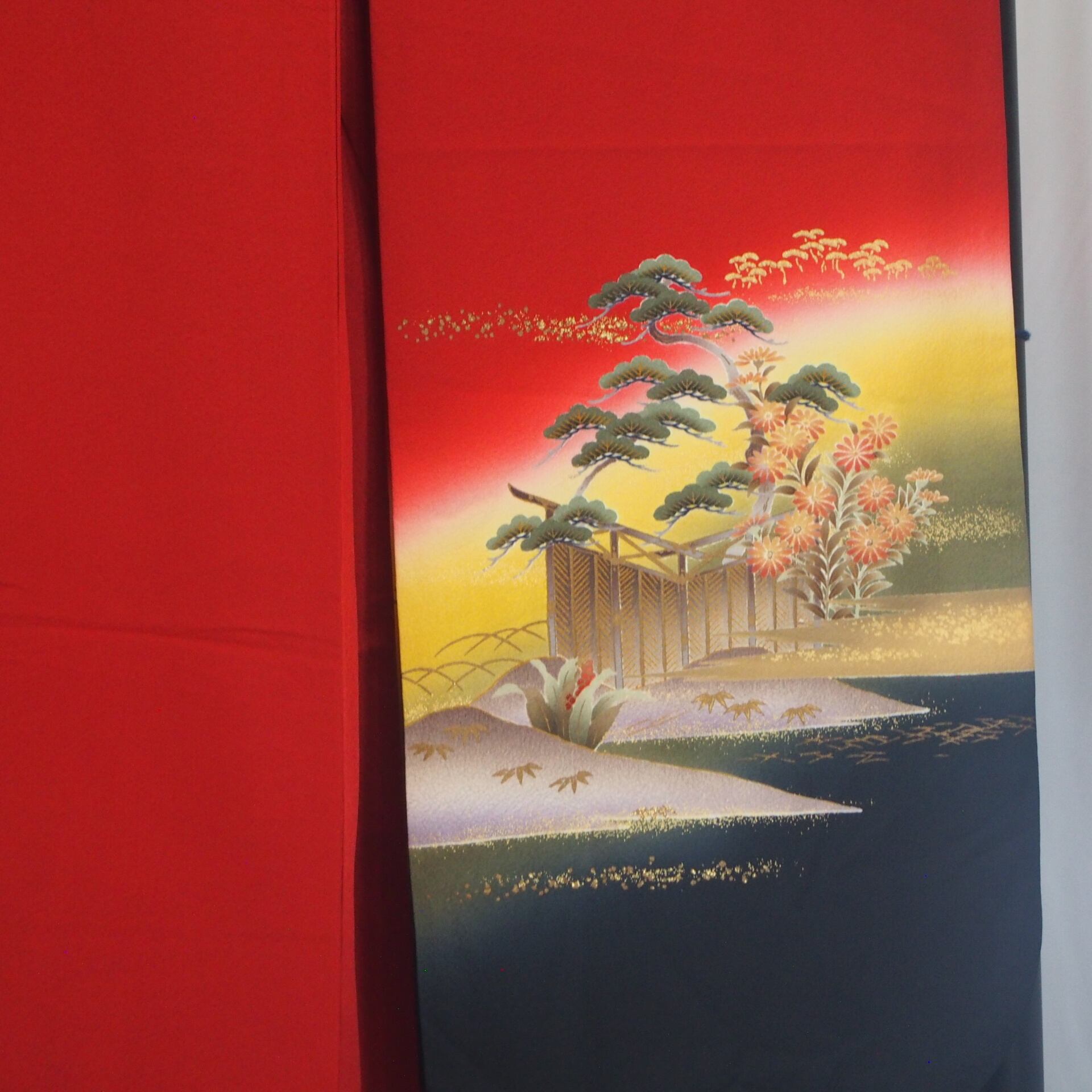 【振袖セット】赤色に松と菊と寝殿柄の振袖 【振袖フルセット】すぐ着られる一式セット|成人式・写真撮影にも◎