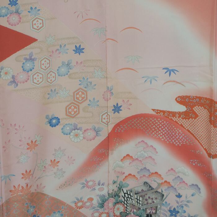 【振袖】桃色綸子地に山野模様と菊・御所車柄の振袖 【振袖フルセット】すぐ着られる一式セット|成人式・写真撮影にも◎