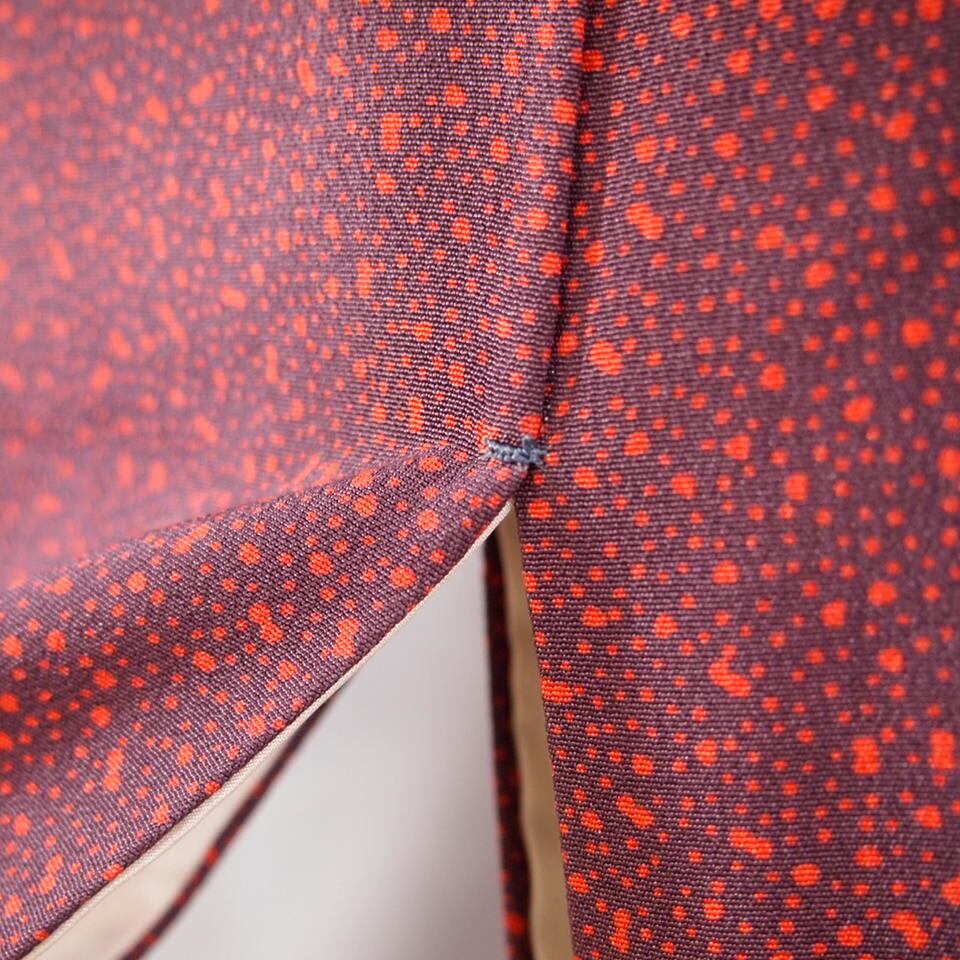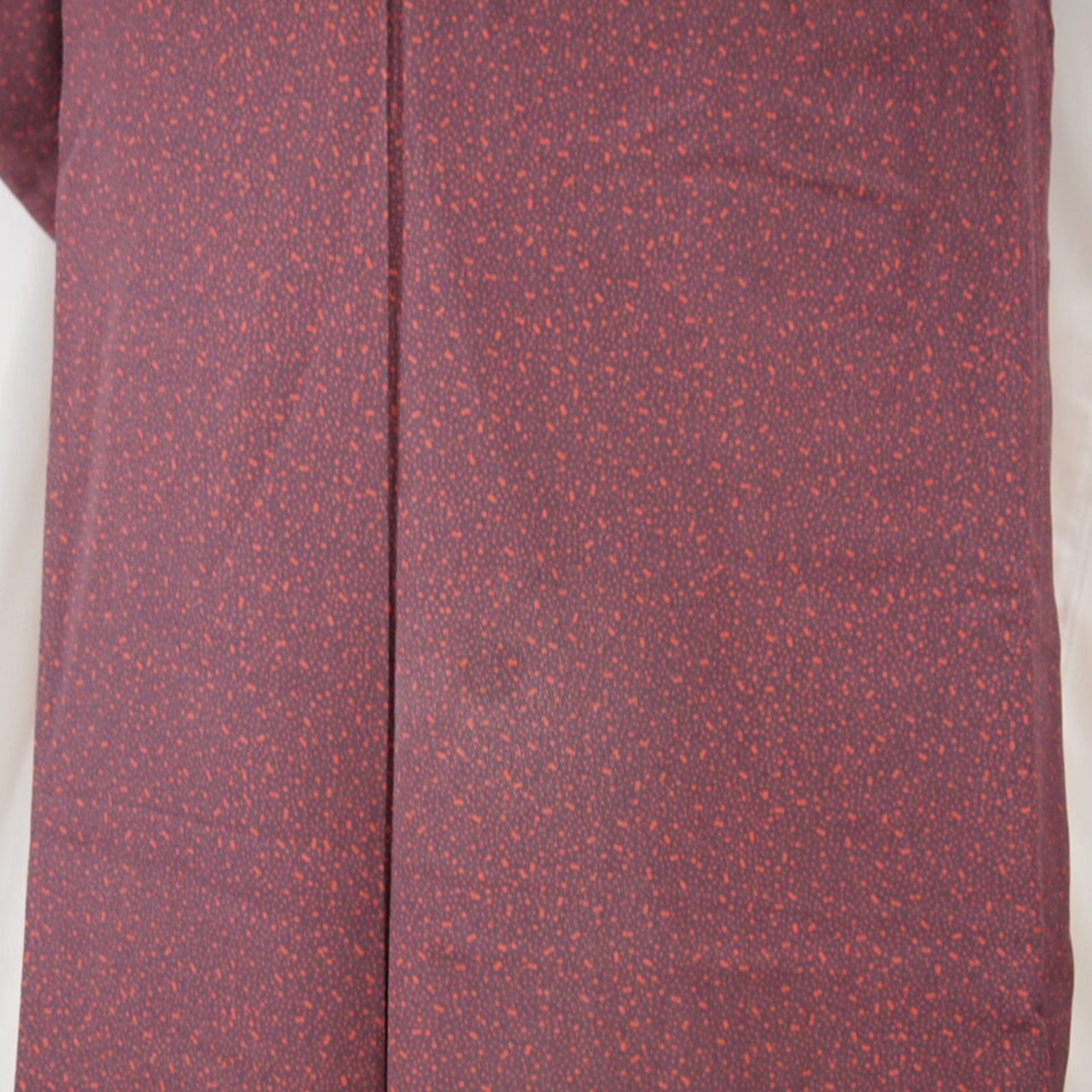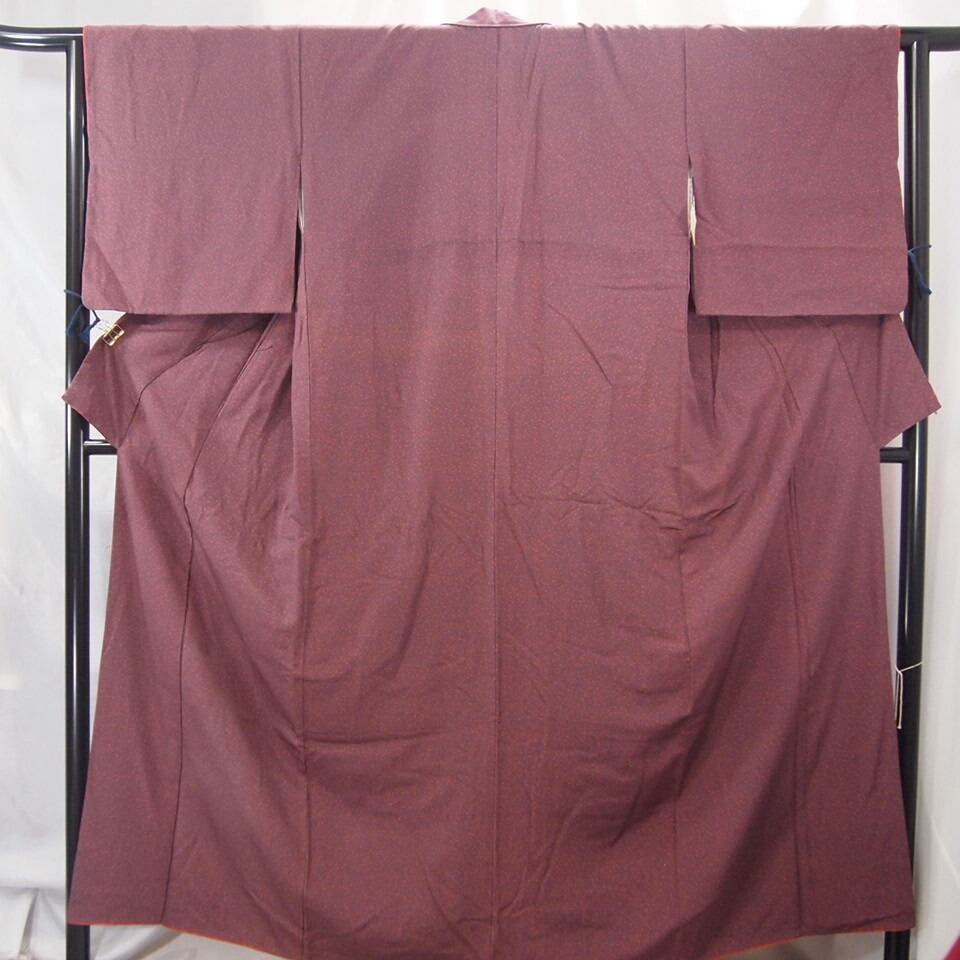 小紋模様の着物をお探しの方におすすめの一枚。茜色と江戸紫が美しく組み合わさった小紋模様が、洗練された上品な印象を与えます。繊細な装飾が施された袖口や裾にも注目していただきたいデザインです。