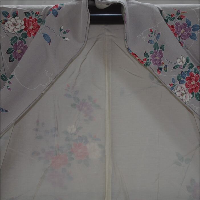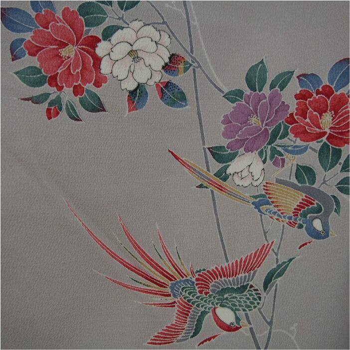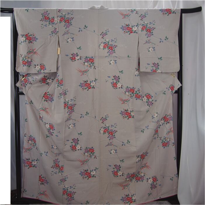 灰桜色で花鳥図柄の着物です。