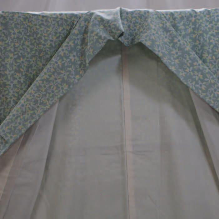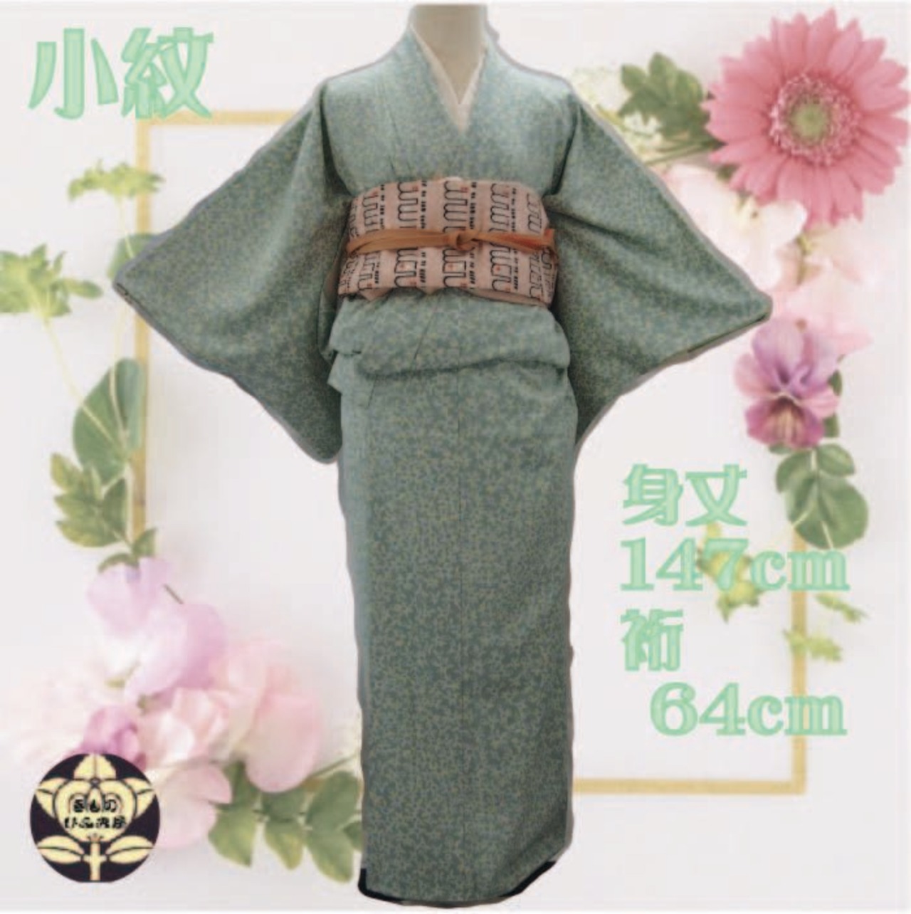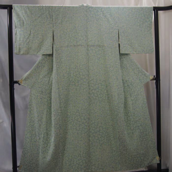 この【小紋】絹地夏虫色に花模様総柄の着物は、繊細で華やかなデザインが特徴です。涼やかな夏虫色と美しい花模様が、上品で女性らしい着姿を演出します。絹地のなめらかな肌触りと軽やかな着心地は、着る人を優雅な気分に誘います。