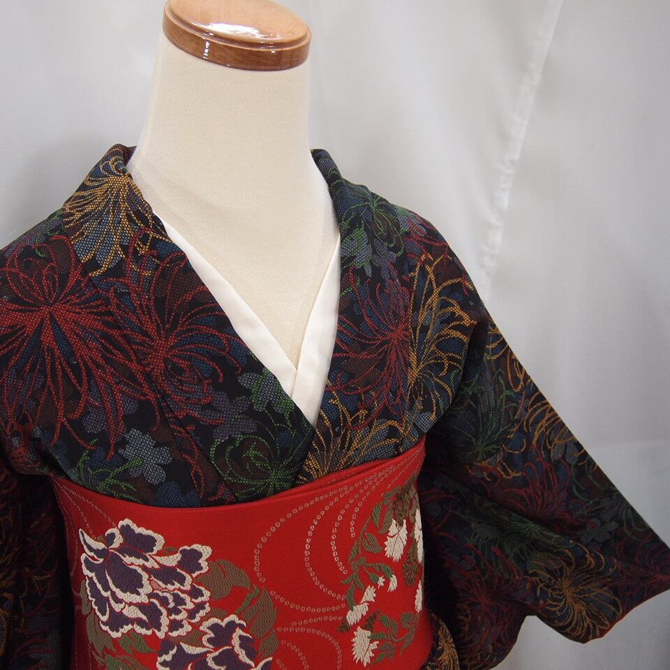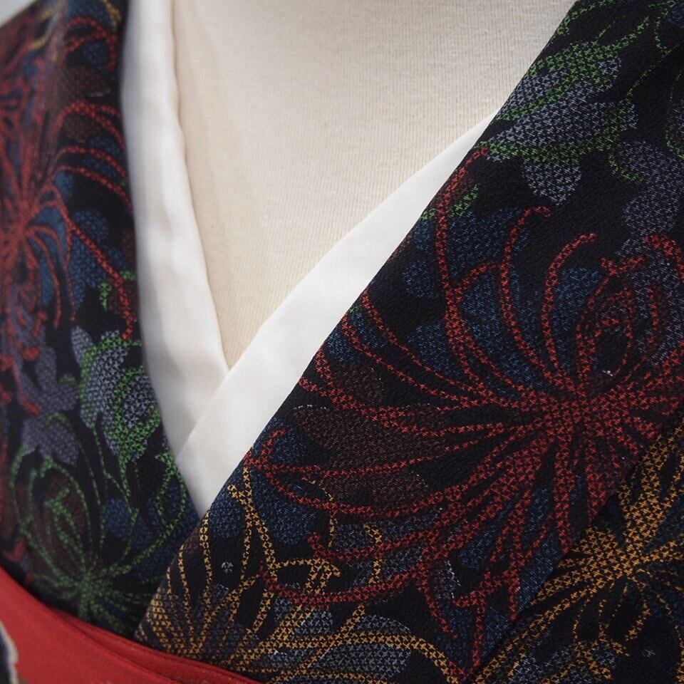 【小紋】黒色に雛菊模様の着物 -||- 手描きの雛菊模様が目を引く、上品な小紋の着物です。黒地に白い模様が繊細に描かれ、華やかでありながら落ち着いた印象を与えます。洗練されたデザインは、どんなシーンでも活躍します。 -||- 歴史ある伝統的な柄を現代に蘇らせた、職人の技と美意識の融合です。日本文化に触れながら、オシャレを楽しんでいただける一着です。 -||- この着物を身にまといれば、日々の生活にユニークな彩りが加わることでしょう。洗練された和の美しさを感じながら、自信と気品を纏って歩いてみませんか。お手入れは専門店にお任せください。