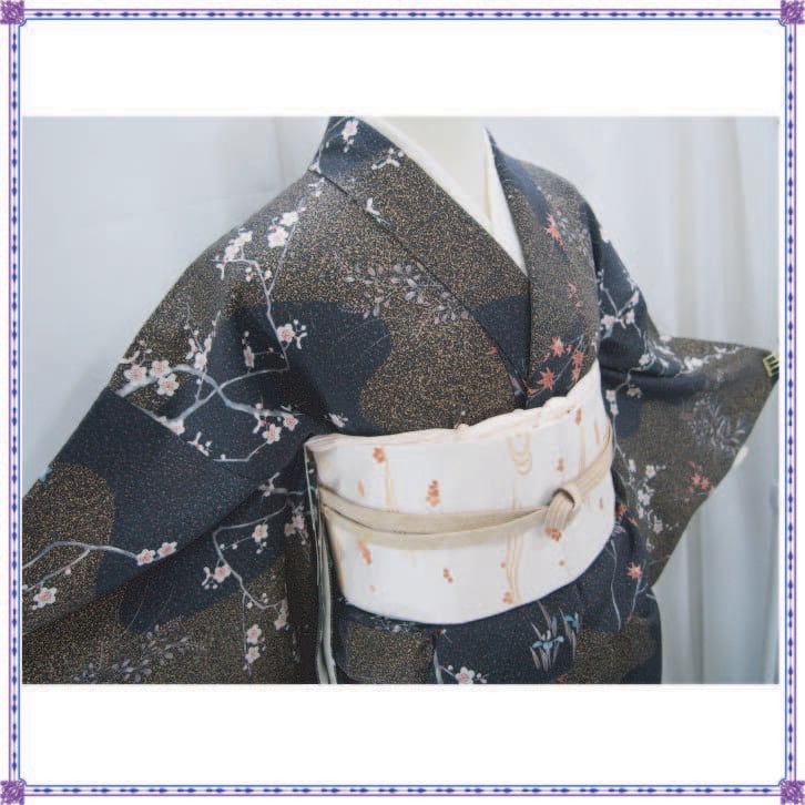 【小紋】黒地に梅と楓と杜若模様の着物は、上品な黒地に梅や楓、そして杜若の美しい模様が施された、和風デザインの着物です。シンプルで落ち着いた色合いながら、繊細な模様が華やかさを添え、着るだけで気品漂う雰囲気を演出します。お茶会やお稽古事、お出かけなど様々なシーンで活躍すること間違いなしです。