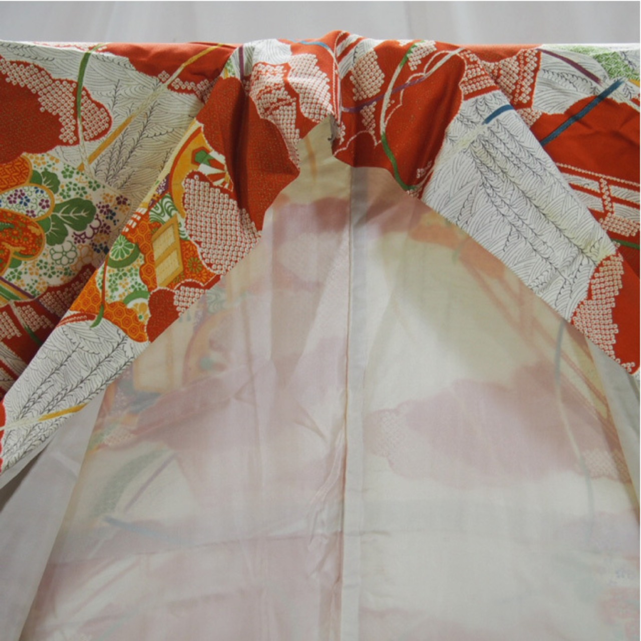 小紋柄の着物で、朱色の雲間と御所車模様が美しい一枚。伝統的な模様と色使いがお洒落な印象を与えます。上品なデザインとシルエットで、お茶会やパーティーなどの特別な場面にもおすすめです。柔らかい肌触りの生地で、着心地も抜群です。