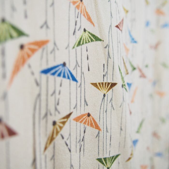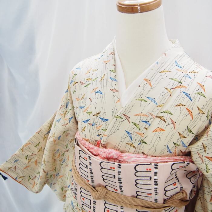 【小紋】象牙色に傘と柳の雨模様の着物。和の風情溢れるデザインが魅力的な一枚です。優雅な色合いと繊細な模様が、着る人を上品に演出します。上品な装いを求める方や、特別な日に特別な一枚を着たい方におすすめの着物です。