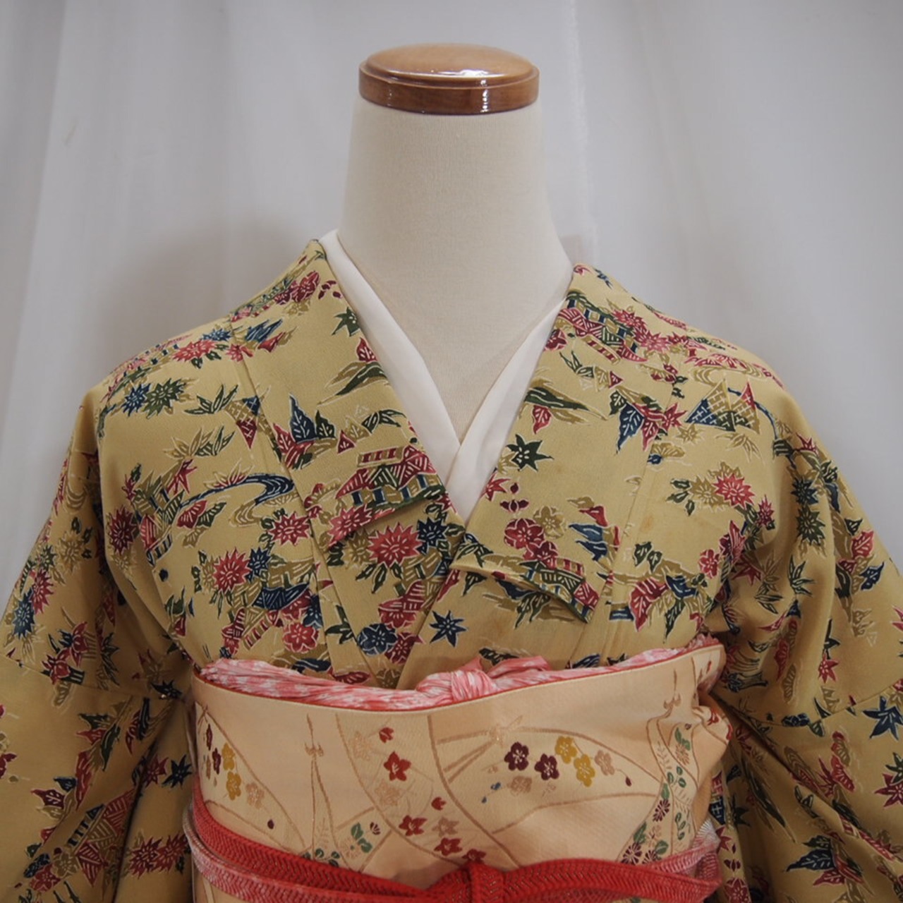 小紋と呼ばれる控えめな柄模様が特徴の梔子色着物。紅型模様が上品さを演出し、落ち着いた色合いが大人の女性にぴったりです。日本の伝統的な着物文化を楽しむ一着として、着こなしの幅が広がります。