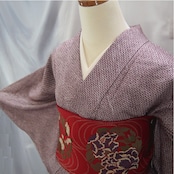 総絞り小紋の藤色に絞り無地の着物は、日本の伝統技法である絞り染めを取り入れた美しいデザインが特徴です。淡い藤色が上品で落ち着いた雰囲気を醸し出し、シンプルな無地もさりげなく華やかさを演出します。着物の上品さと絞り染めの繊細な美しさが融合した一着で、特別な日やお出かけにぴったりです。