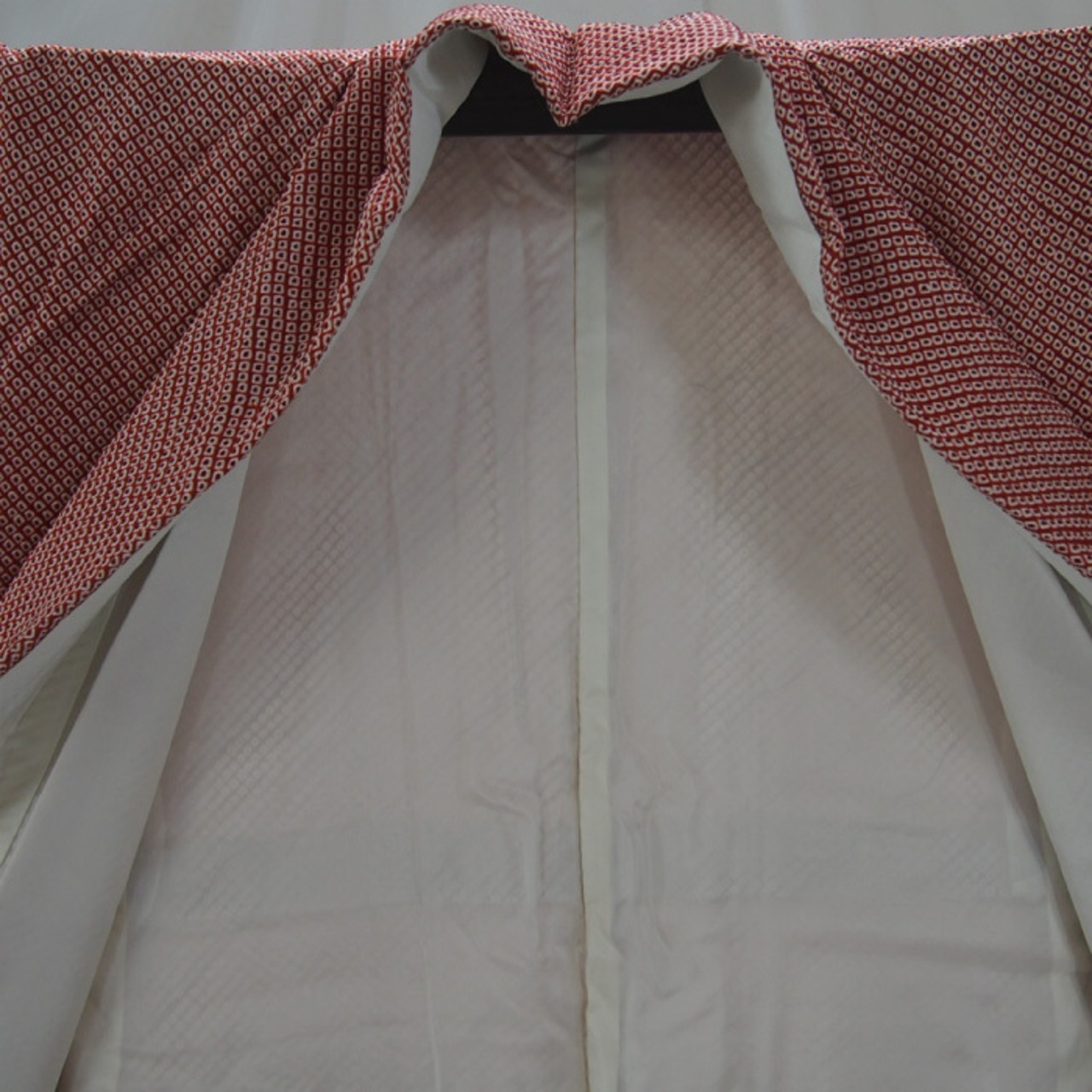 この緋色に絞り無地の着物は、どこか懐かしい雰囲気と上品さを兼ね備えています。総絞りが施された生地は、独特の光沢感と風合いを持ち、どんな季節やシーンでも活躍する一枚です。身頃や袖口に描かれた絞り模様が、着る人の上品さを引き立てます。