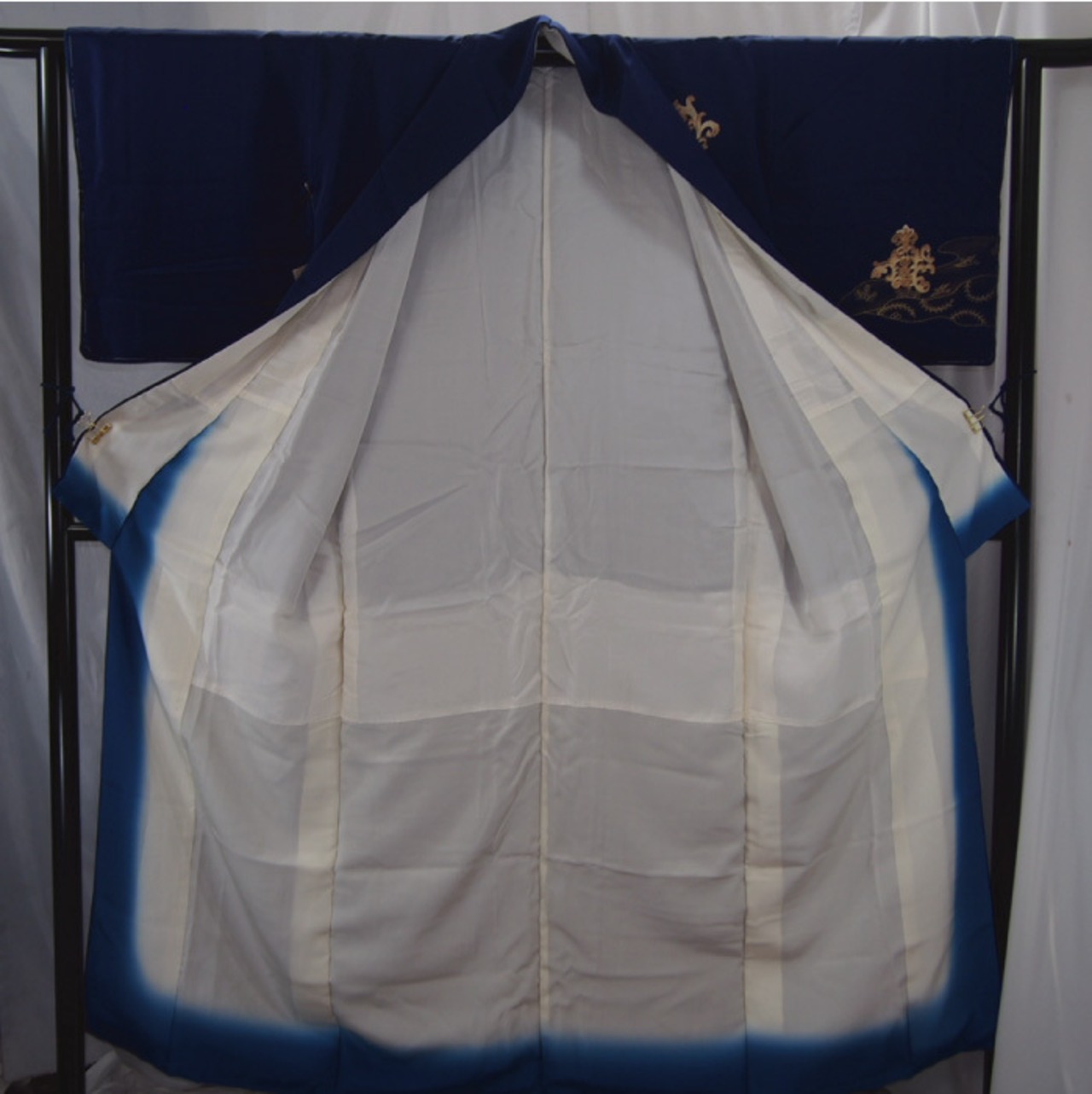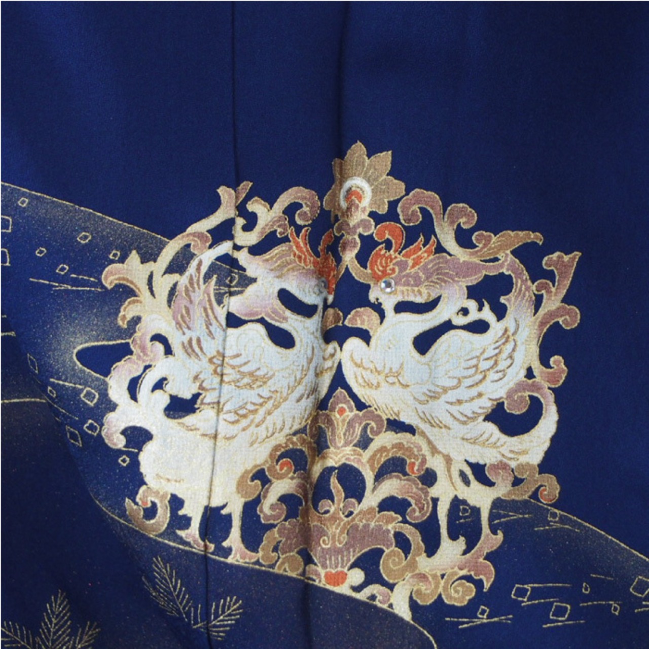 訪問着「青色に流水と西洋の鳥のレリーフ柄の着物」は、洗練されたデザインが特徴です。青色のベースに描かれた流水と西洋の鳥のレリーフ柄が、和と洋の融合を表現しています。華やかながらも落ち着いた色使いが、上品で美しい装いを演出します。