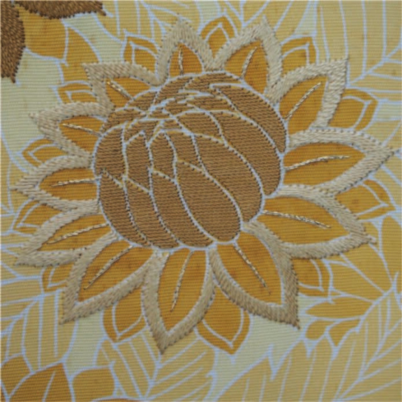【名古屋帯】絹地ウコン色に刺繍向日葵柄の帯