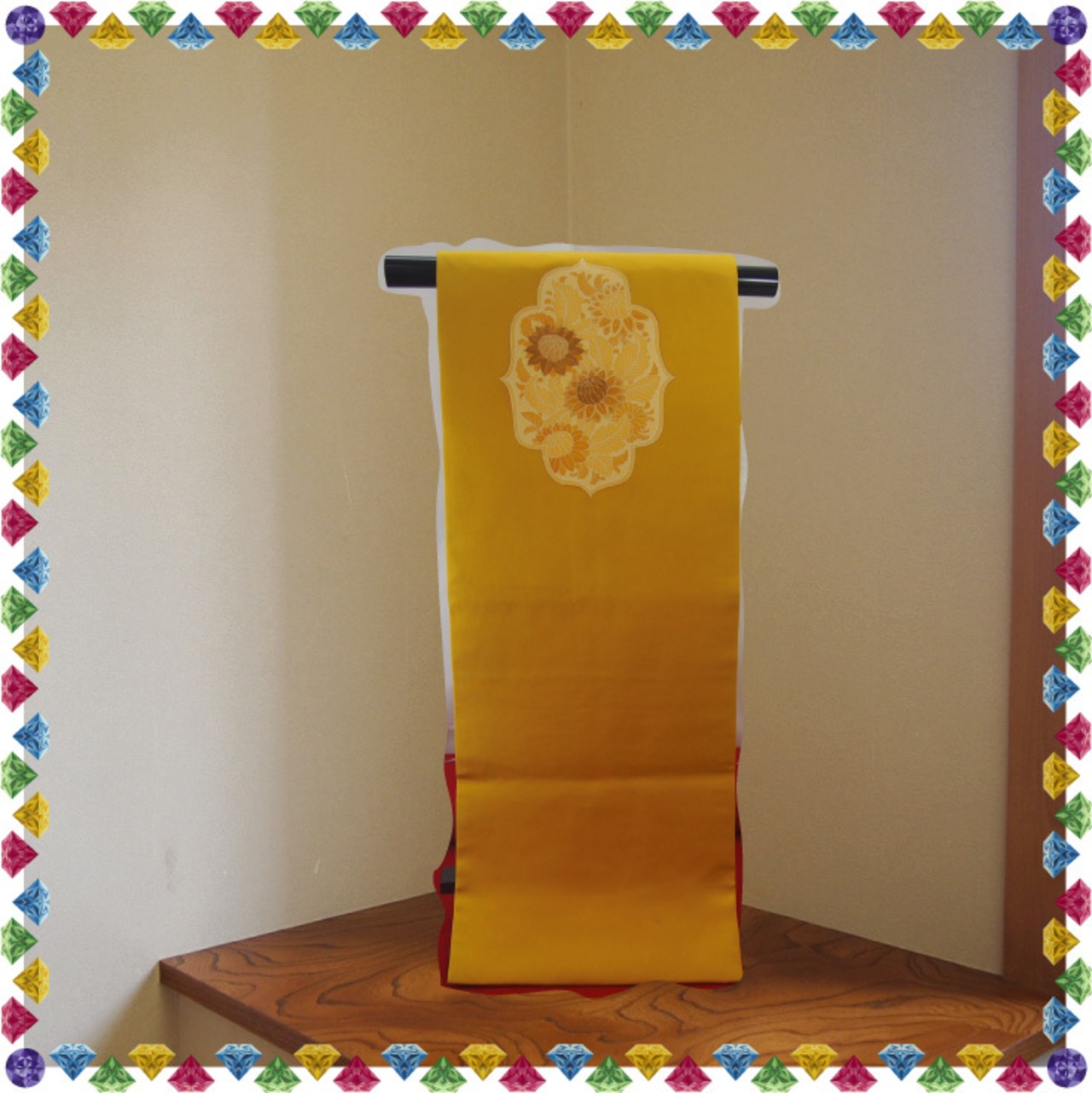 黄色で、手書きと刺繍の向日葵柄の帯です。