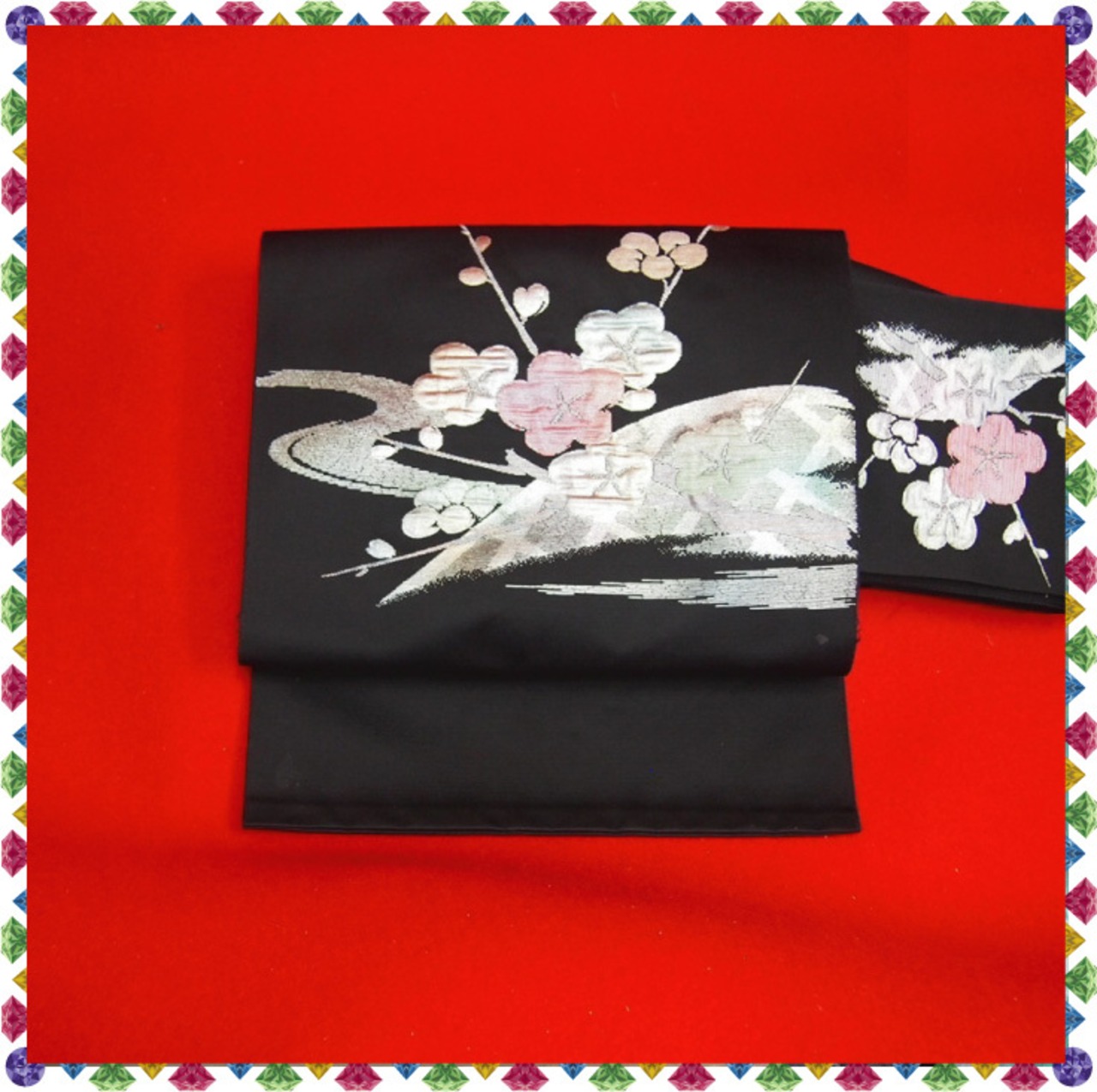 名古屋帯の文様が美しく、黒地に梅の花柄が優雅に描かれた帯です。黒色のシックな地色と、優雅な梅の花柄が調和し、着物のコーディネートに上品さを加えます。洗練された印象を与える名古屋帯は、結婚式やお茶会、パーティーなどのフォーマルな場面にも最適です。