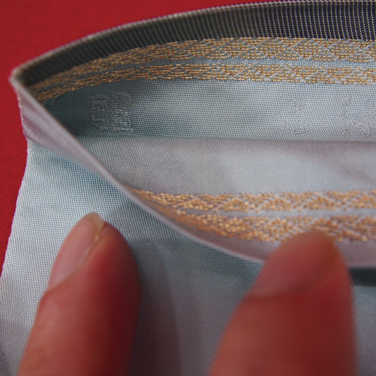 引箔は緯糸と共に箔を織り込む技法である。箔には金箔、銀箔、柄箔がある。