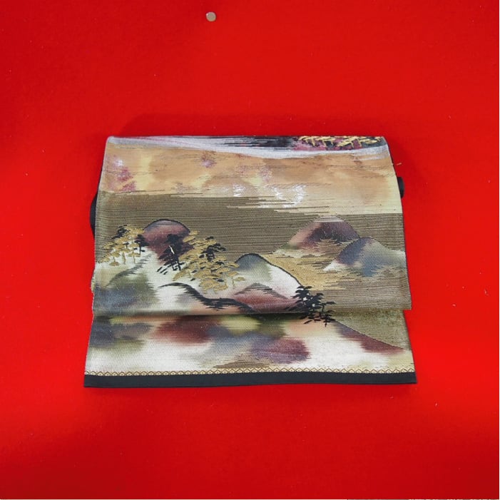 この【袋帯】は、柔らかな風合いと繊細な霞がかった山野模様が特徴。シンプルな着物の装いにアクセントを加え、洗練された和の装いを演出します。職人の手によって一点一点丁寧に作り上げられる帯は、まるで絵画のような美しさがあります。