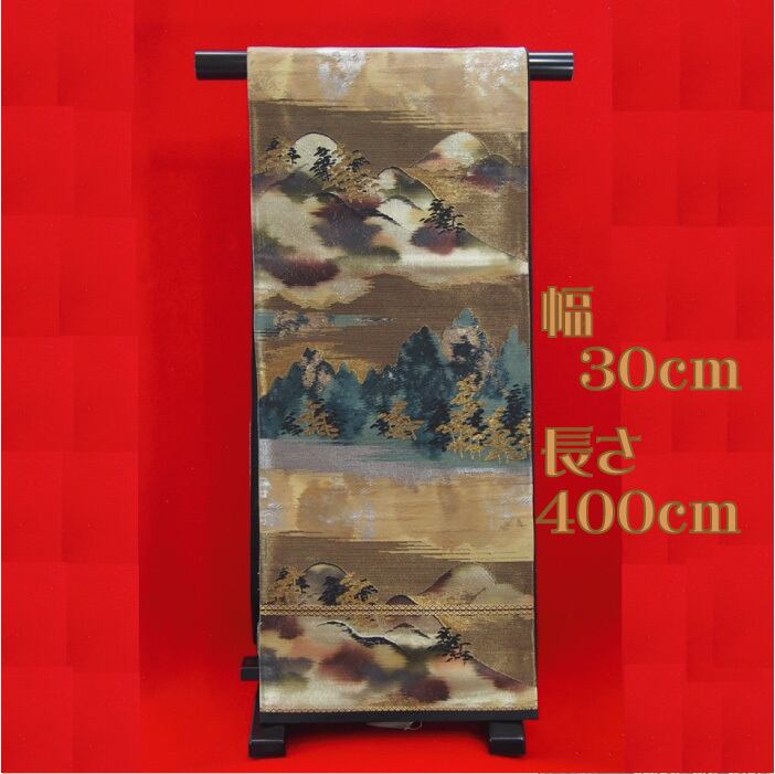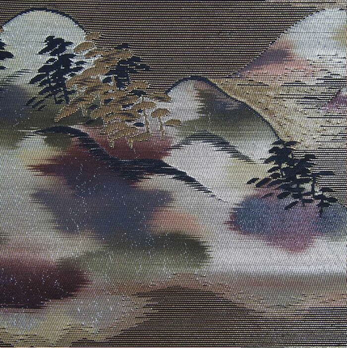 独特の霞がかった山野模様が施された上質な袋帯。洗練された和の装いを演出します。