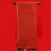 和装に映える、上品な赤白色の更紗模様が特徴の昼夜帯