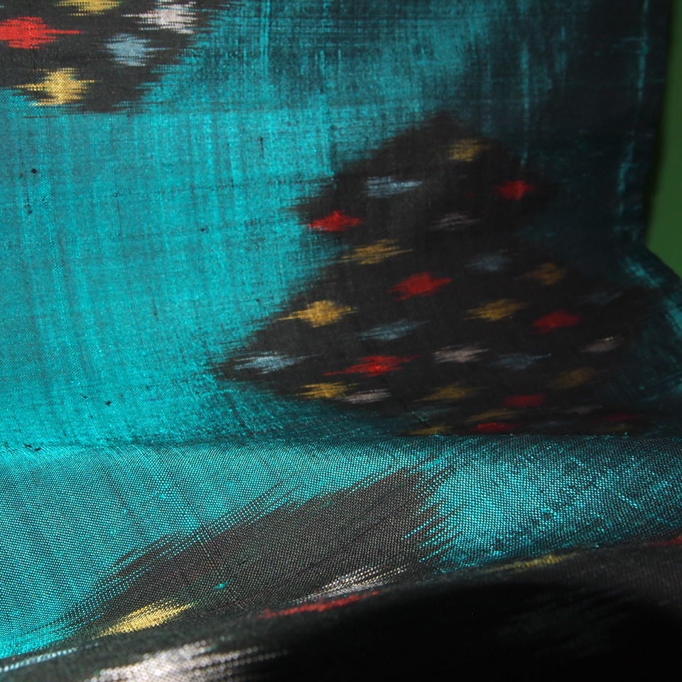 緑色の銘仙地に黒い菱型模様の中にカラフルな柄が入った着物です。
